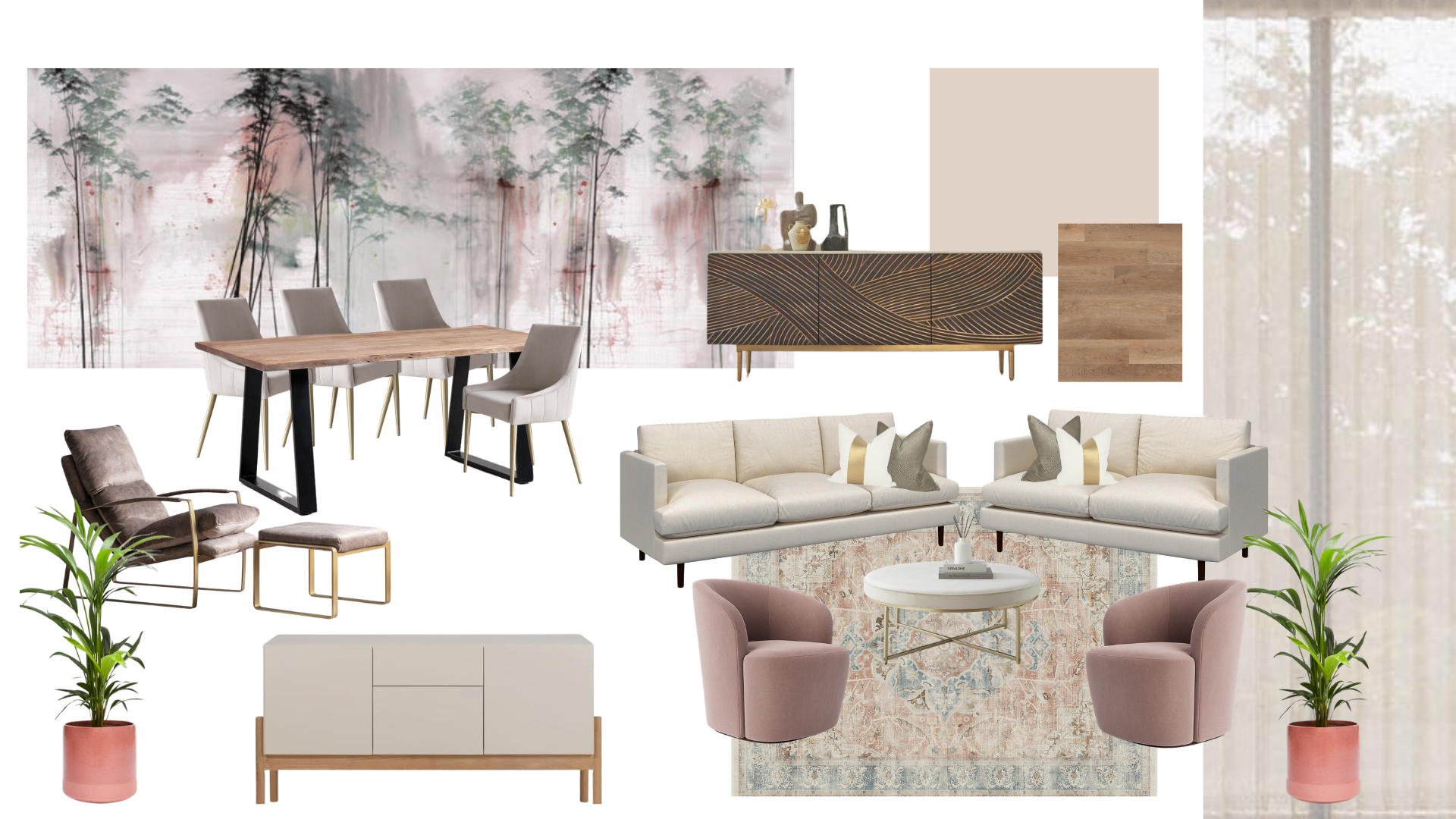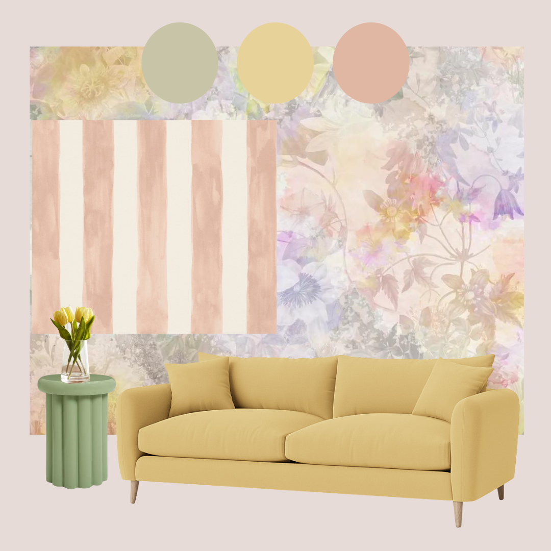 A curated digital colour board presenting your scheme with recommended paint, wallpaper, fabric and key furniture piece.